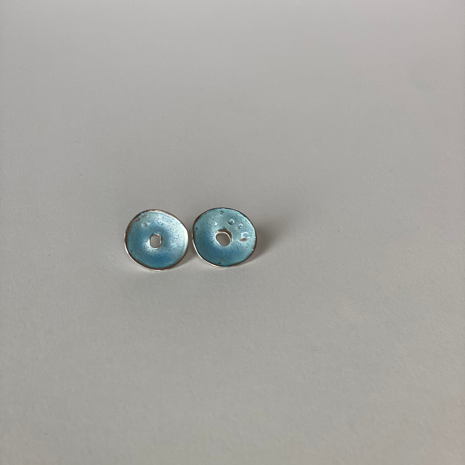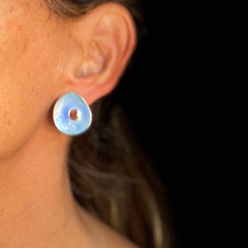 The Atoll, earrings are hand-crafted from recycled sterling silver and light blue vitreous (glass) enamel. The uneven sculptural surface contrasts with the polished finish edges.