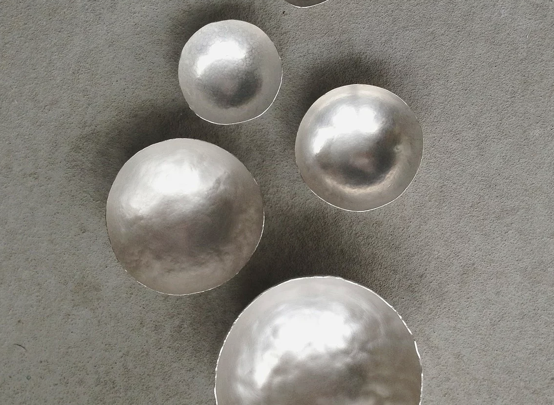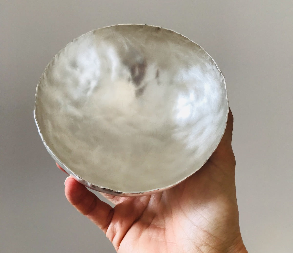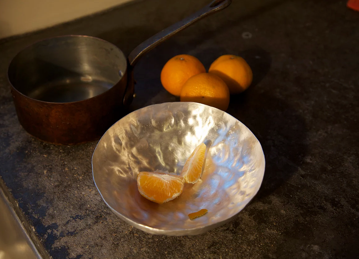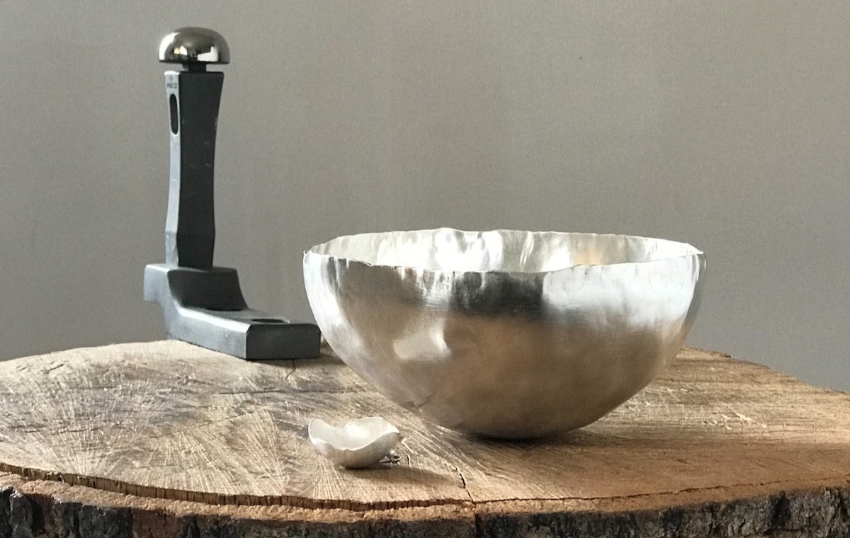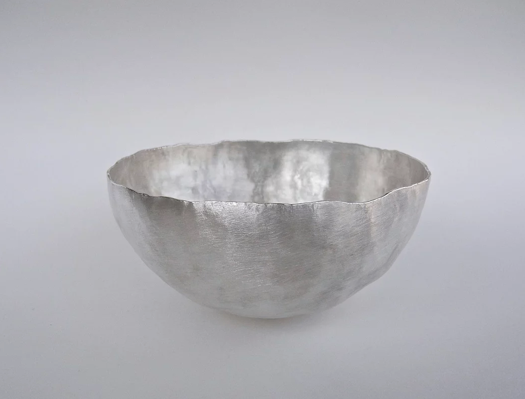 I make these bowls to order using recycled solid fine silver. The uneven sculptural surface contrasts with the polished finish edges. I leave the bottoms flat so the bowls sit on a flat surface.