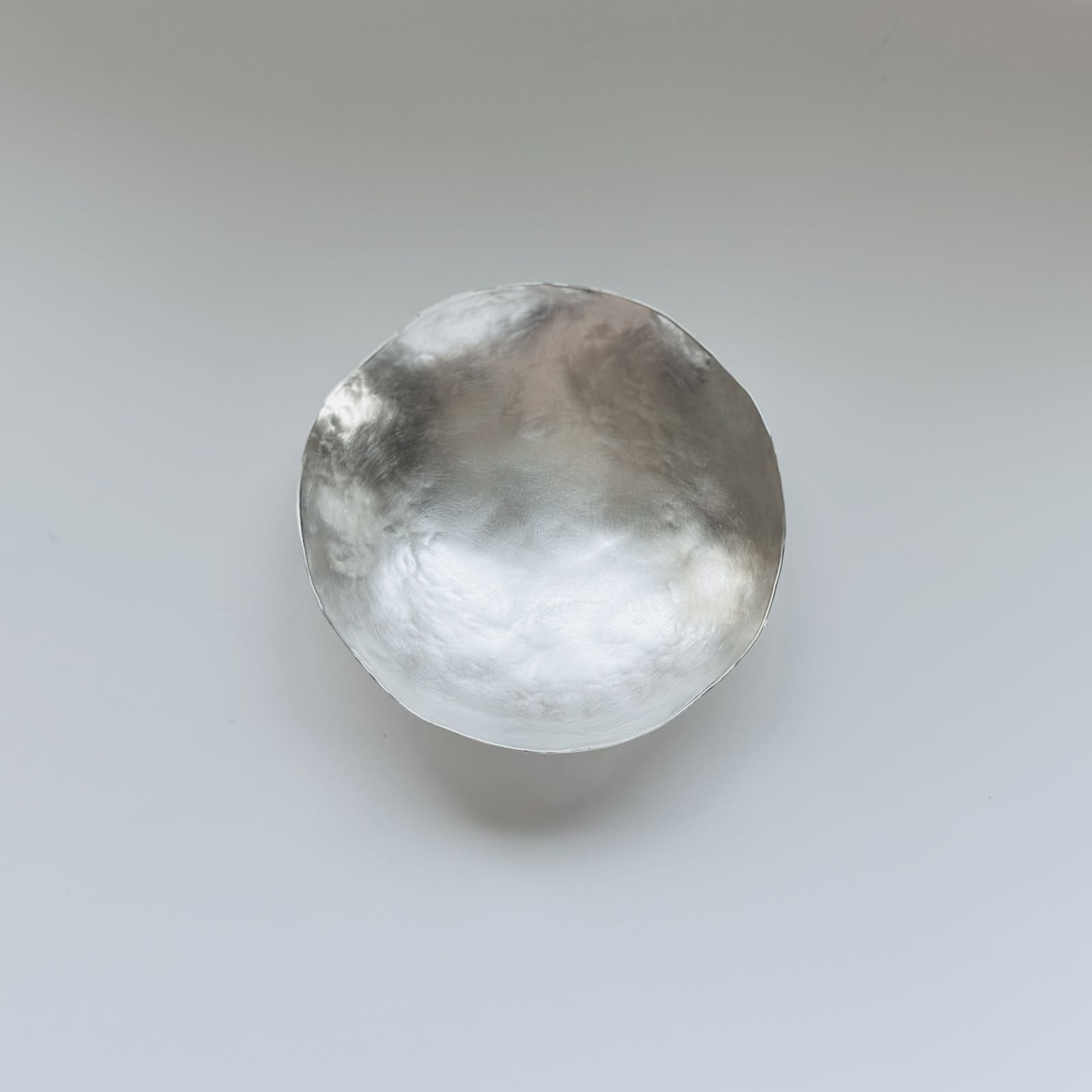 I make these bowls to order using recycled solid fine silver. The uneven sculptural surface contrasts with the polished finish edges. I leave the bottoms flat so the bowls sit on a flat surface.