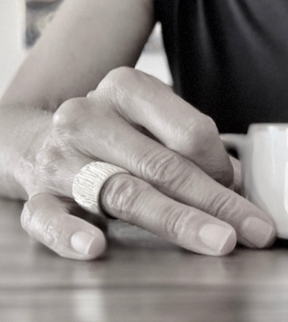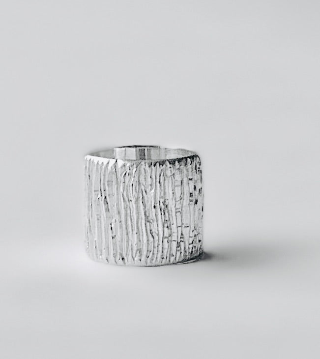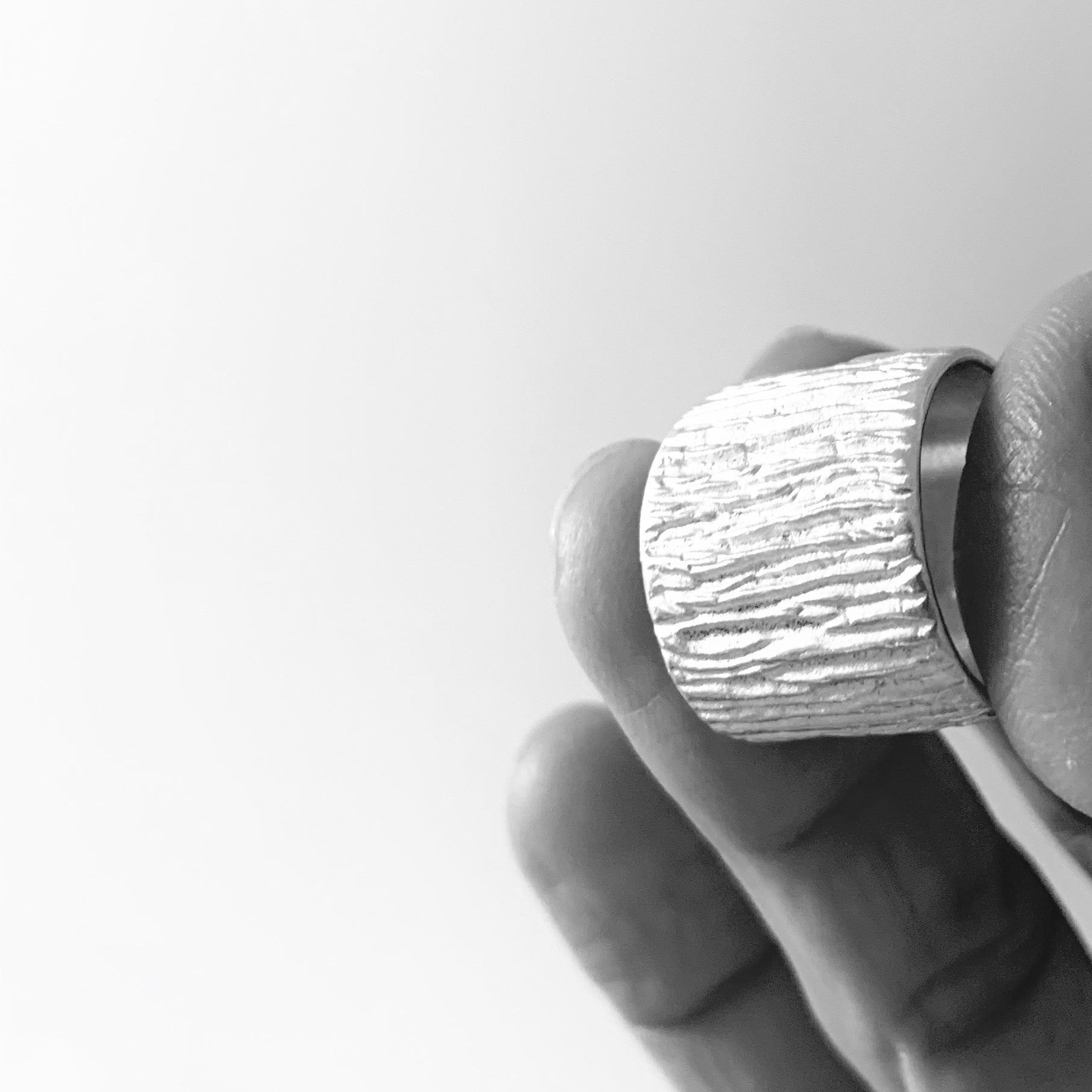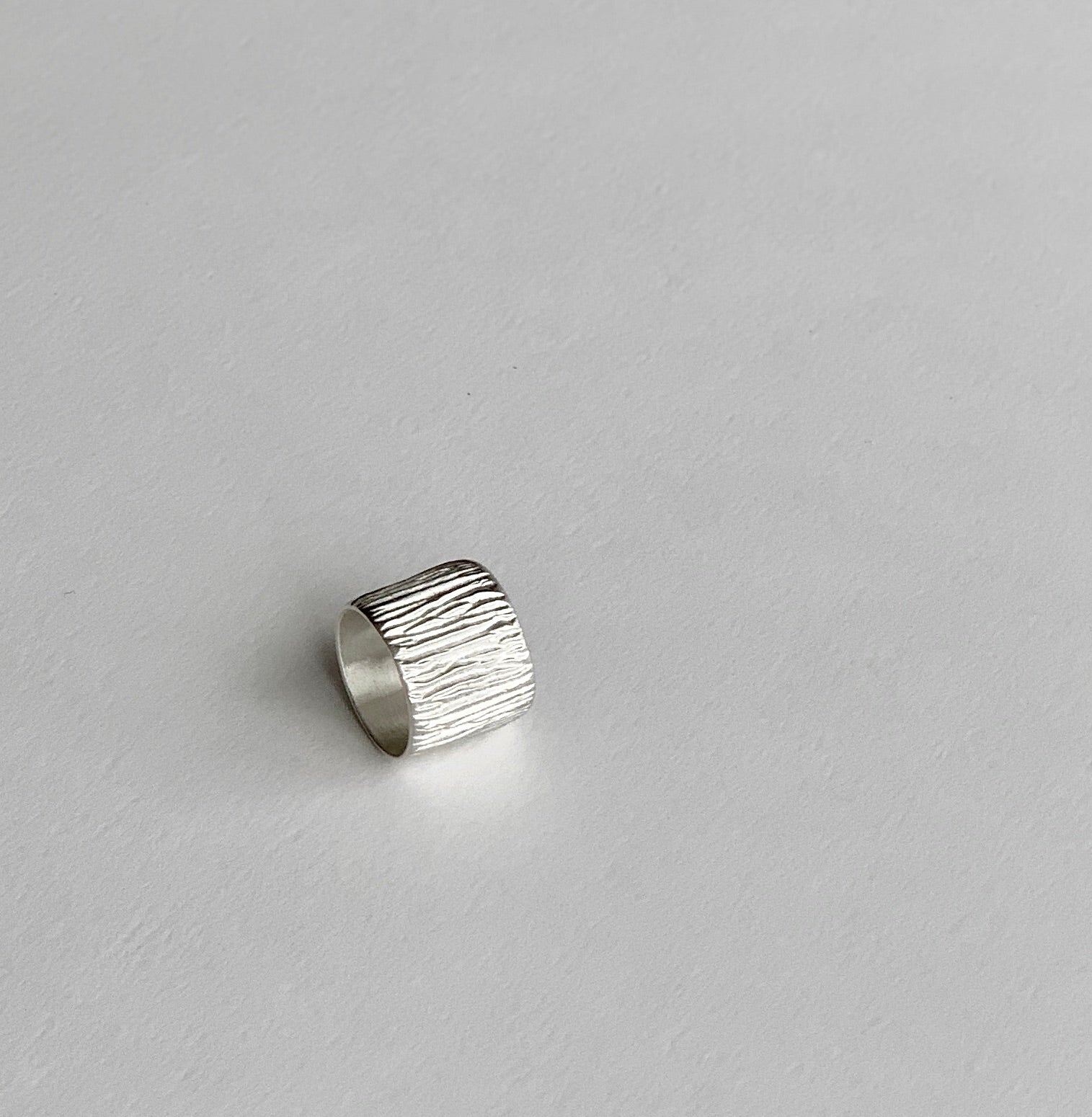 The Sand Ring is a contemporary band, hand-crafted from solid recycled sterling silver. The uneven sculptural surface contrasts with the inside polished finish.