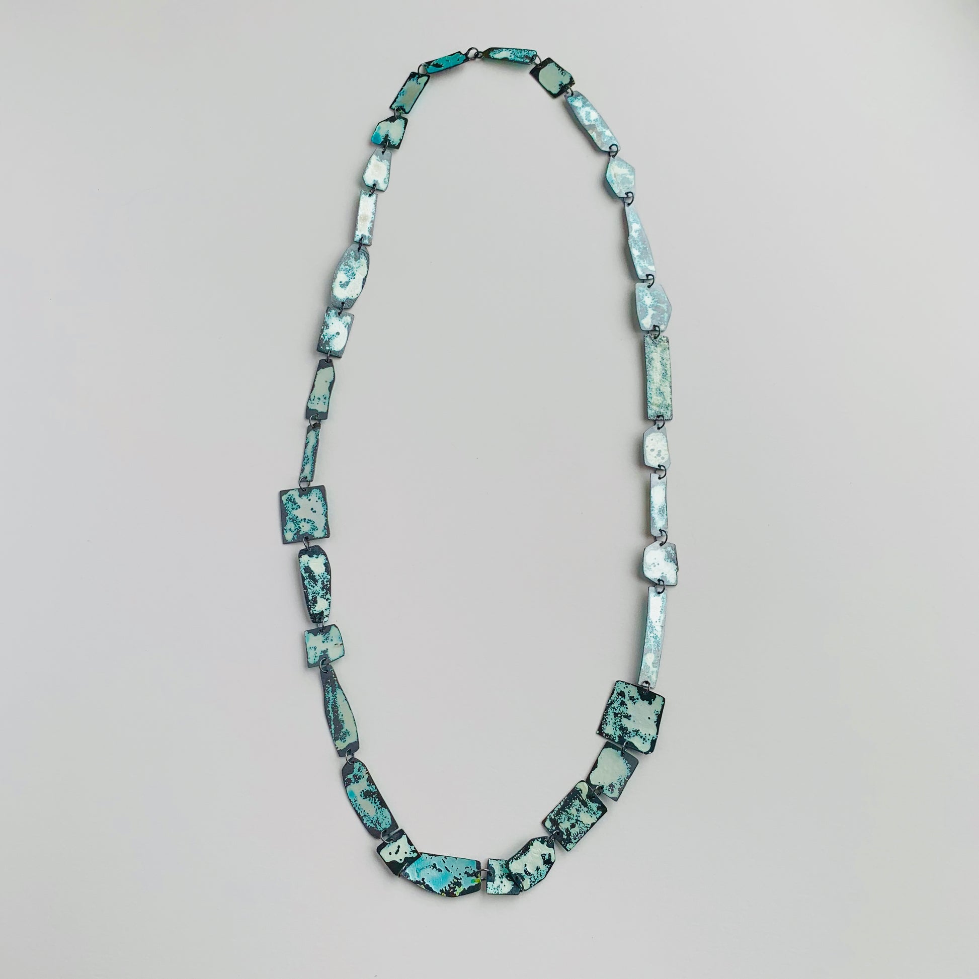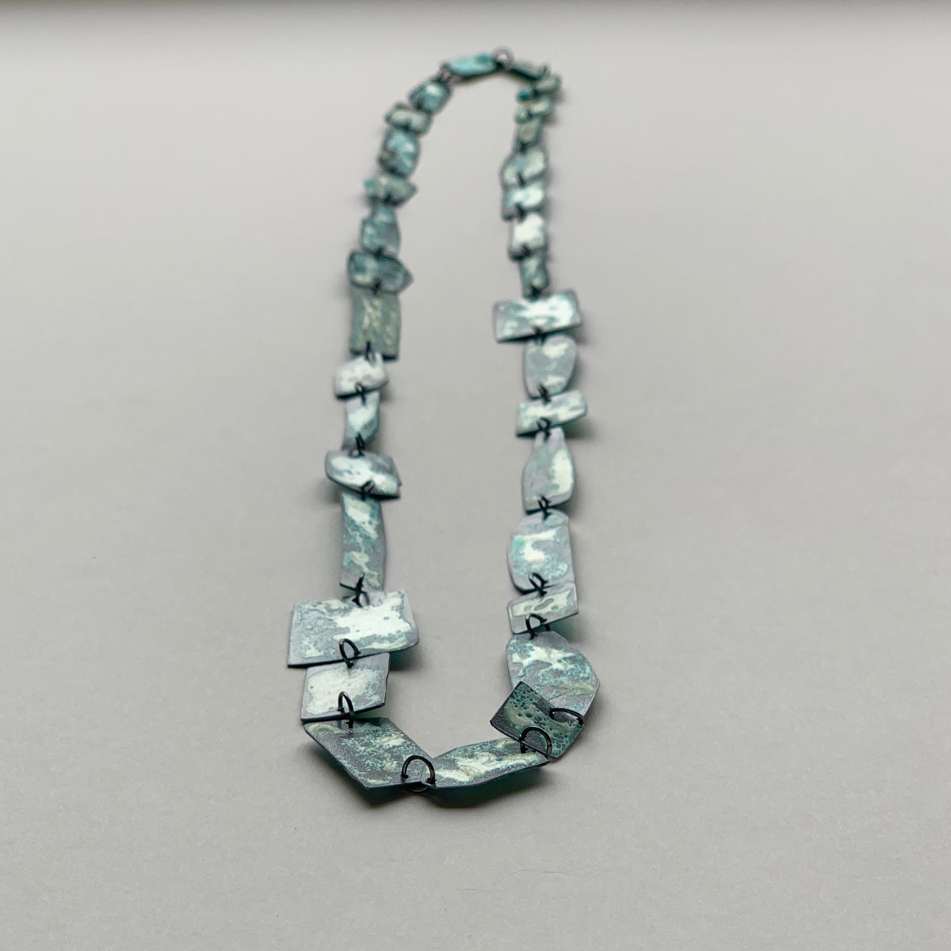 Hues of light blue to bright aqua color on both sides, oxidized silver.