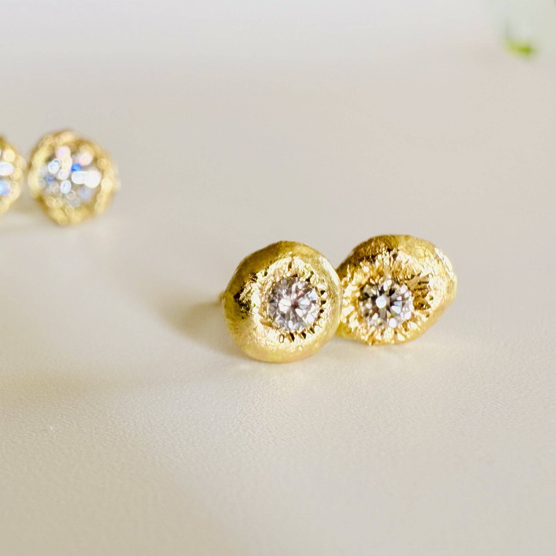 Nearly perfect diamonds contrast with a matte hand sculpted, organic solid 18K yellow gold setting.